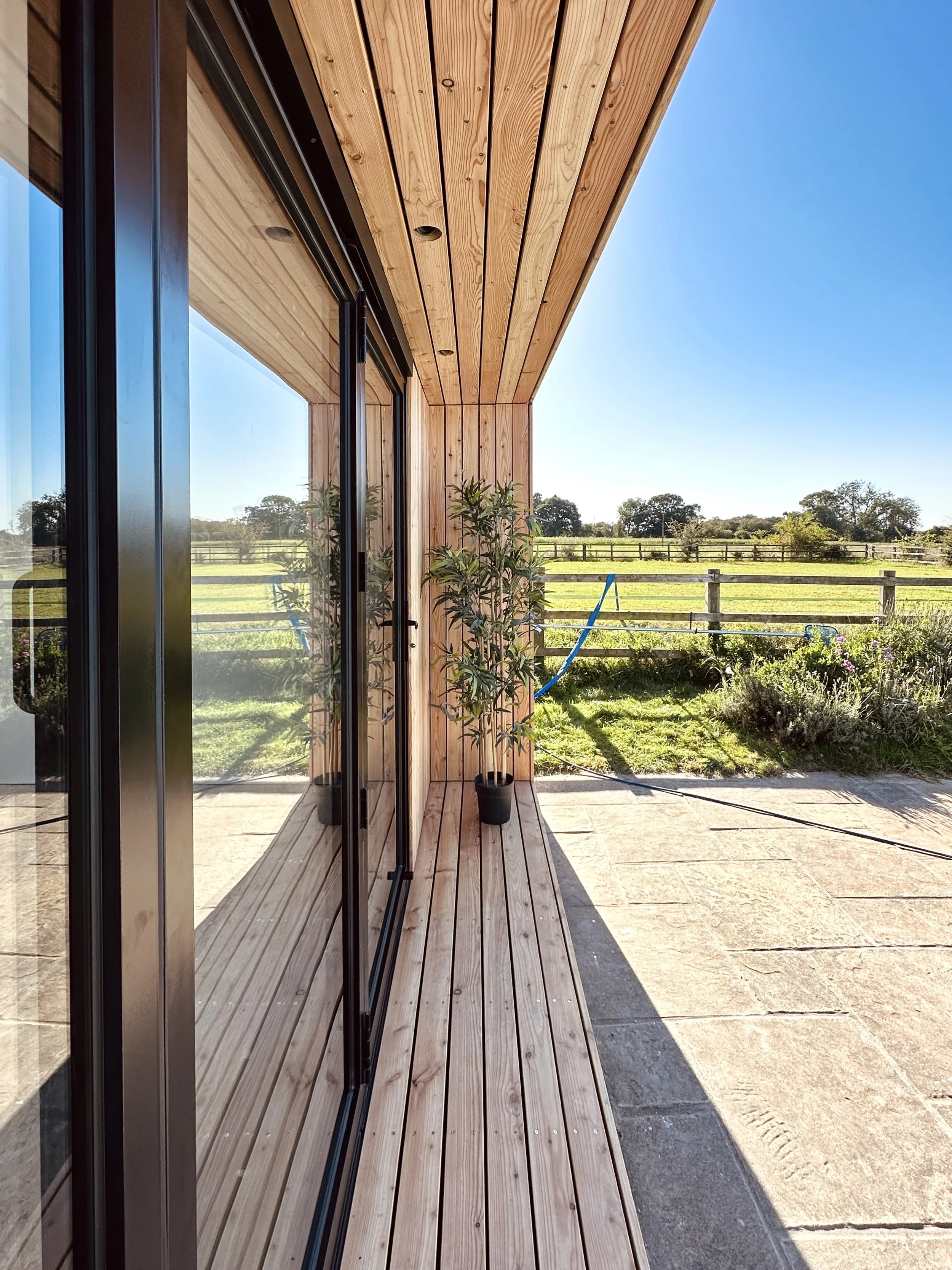 We use premium materials throughout, including fully insulated walls, floors, and roofs, finished with high-quality Thermowood or Larch cladding. Large aluminium bi-fold or sliding doors flood each space with natural light, creating a seamless connection between indoors and outdoors.